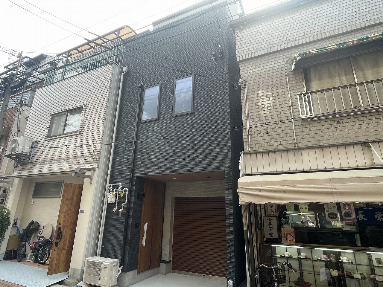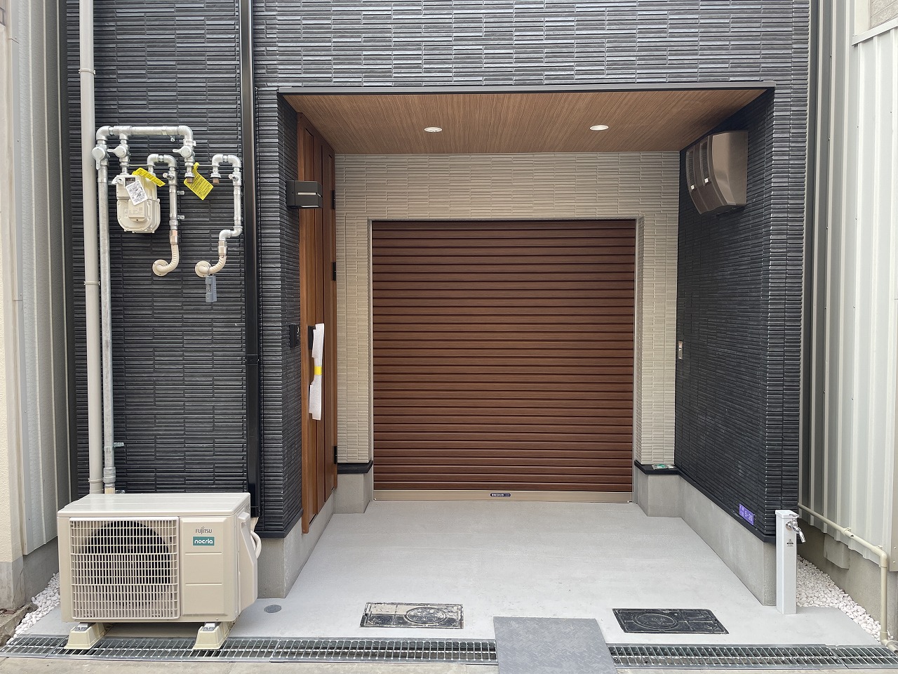 1階店舗のシャッター部は木目調に仕上げましたので、温かみもあり周りの物件との調和が